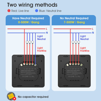 -- [Προβλήματα εγκατάστασης και συμβατότητας]: Δεν απαιτείται τροποποίηση καλωδίων, συμβατό με κυκλώματα με ένα καλώδιο και με ουδέτερο καλώδιο, υποστηρίζοντας συνολικές τάσεις από 110-240V,εύκολη αντικατάσταση παραδοσιακών διακόπτες, βολικό για εγκατάσταση.